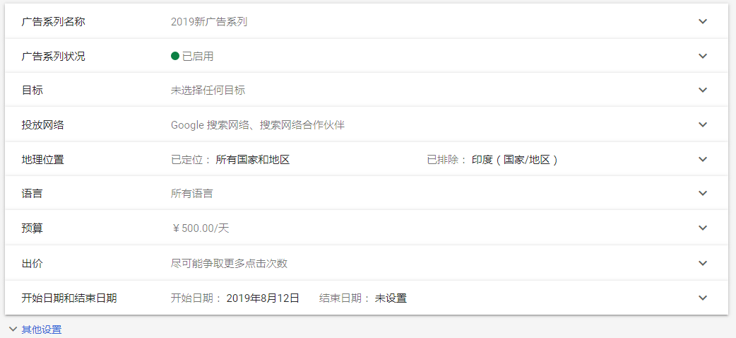 在广告系列层级,您可以设置每日预算,投放国家,语言等更多参数。如下图: