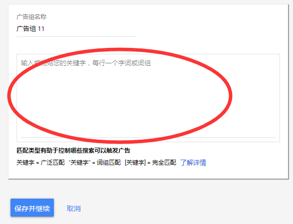 接下来开始建设广告组,在广告组一级,您可以设置关键词(数量不限),广告描述语,关键词每次点击最高出价等等。