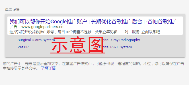 请注意,上图中深灰色的地方,还有4个小标题,这是谷歌为了增显广告视觉,特意为每位客户提供的谷歌推广附加信息(附件信息包括:附加链接,附加宣传语,附件电话,附加地址等等)。