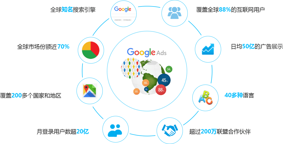 精准把握不同地区和市场行情,利用Google搜索广告全面性,全面提升网站排名、流量及转化